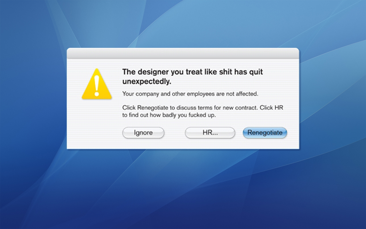 “The designer you treat like shit has quit unexpectedly.” Posted byThomas GuyNovember 26, 2009Posted inAwesomesauce WGSDC.jpg (1280×800). Share this: Click to share on X (Opens in new window) X Click to share on Facebook (Opens in new window) Facebook Click to share on Reddit (Opens in new window) Reddit Click to email a link to a friend (Opens in new window) Email Like Loading... Related Published by Thomas Guy Everybody dance. Everybody dance, now. View more posts