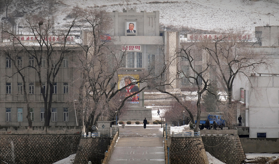 Portraits of North Korea’s former leader and founder, Kim Il-Sung, are pictured on buildings in the North Korea border village of Namyang, seen from the town of Tumen in China’s Jilin province across a bridge spanning the Tumen river that separates the two countries on March 21, 2009. North Korea confirmed on March 21 that it had detained two US journalists along the border with China earlier this week after the US State Department had expressed concern over the fate of the two women, who were believed to have been taken into custody by border guards patrolling the Tumen river. AFP PHOTO/Peter PARKS (Photo credit should read PETER PARKS/AFP/Getty Images)