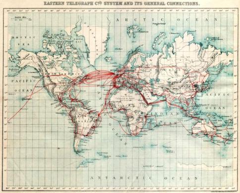 Early 1980s intercontinental internet traffic followed (geographically) the same basic infrastructure that had existed for much of the previous century. The image above illustrates early submarine telecommunications lines.