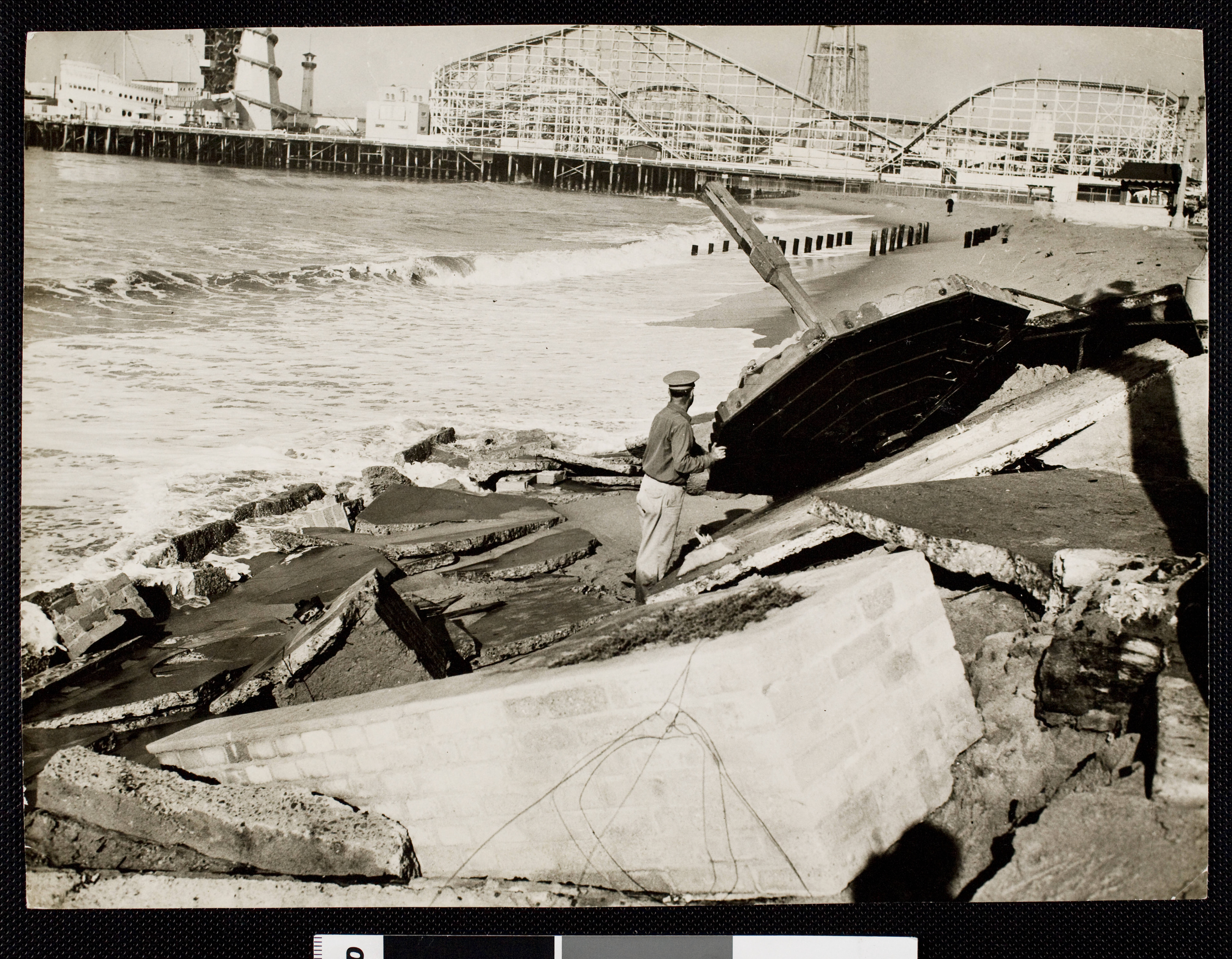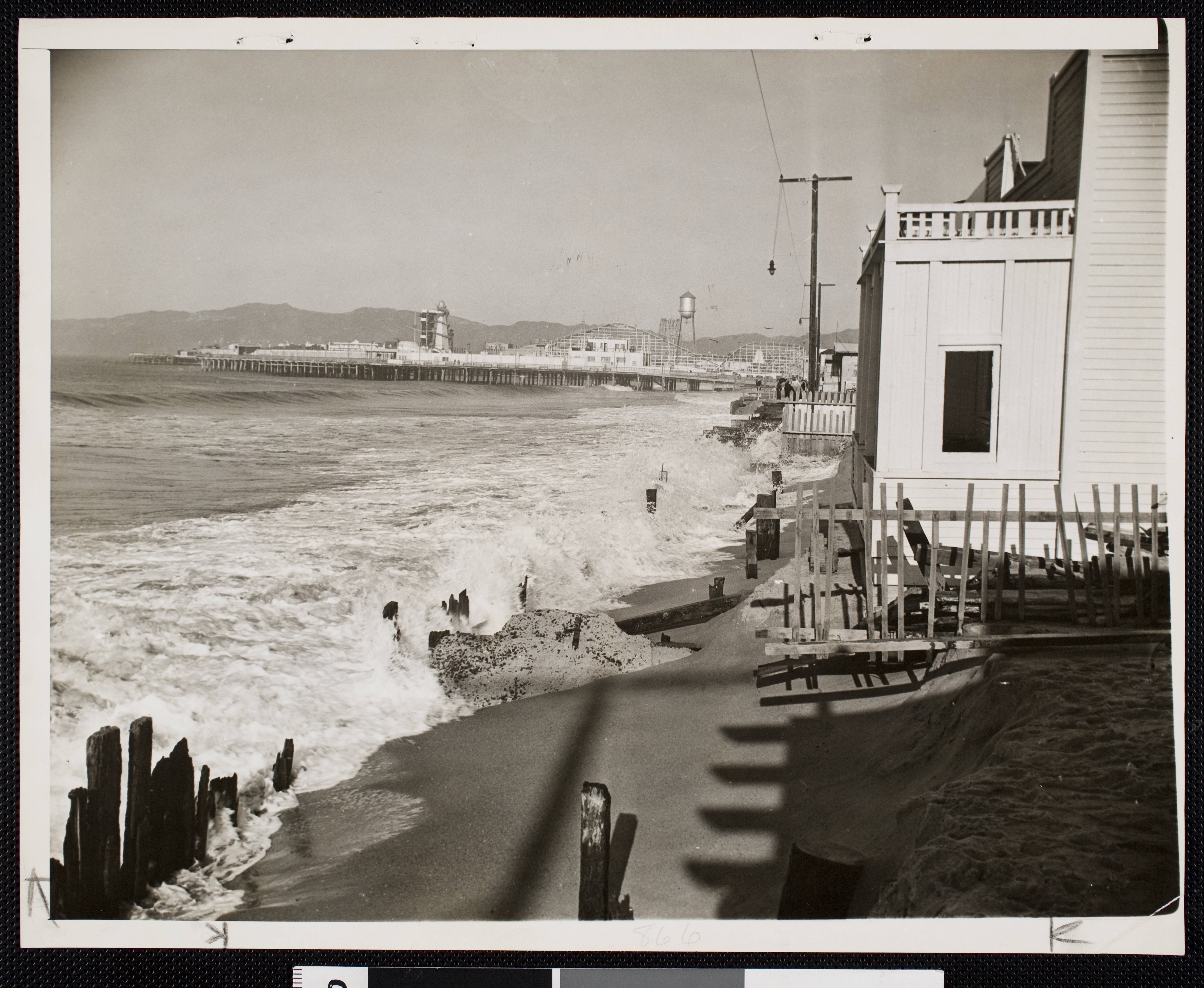 The final photo shows the tidal erosion had crept all the way to Ocean Front Walk, taking with it at least one of the umbrella-shaped sun shades that once lined the pedestrian thoroughfare. I’m sure the war effort – and civil defense planning – hindered attention to this disaster. It’s still something to see it in action.